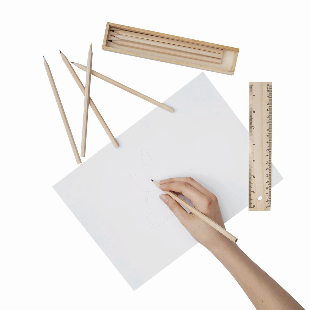 8-delige geslepen potloodset STRAIGHT in houtendoosje met liniaal deksel.