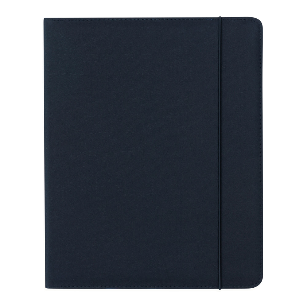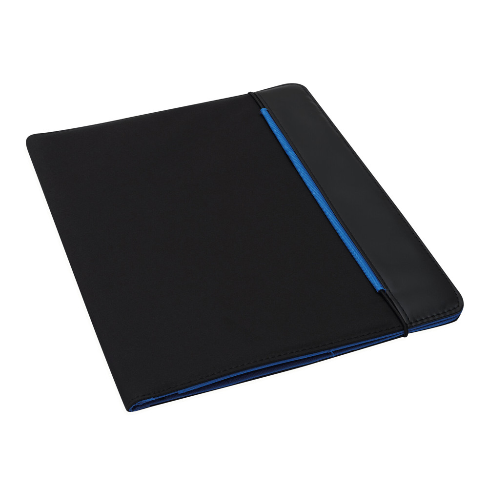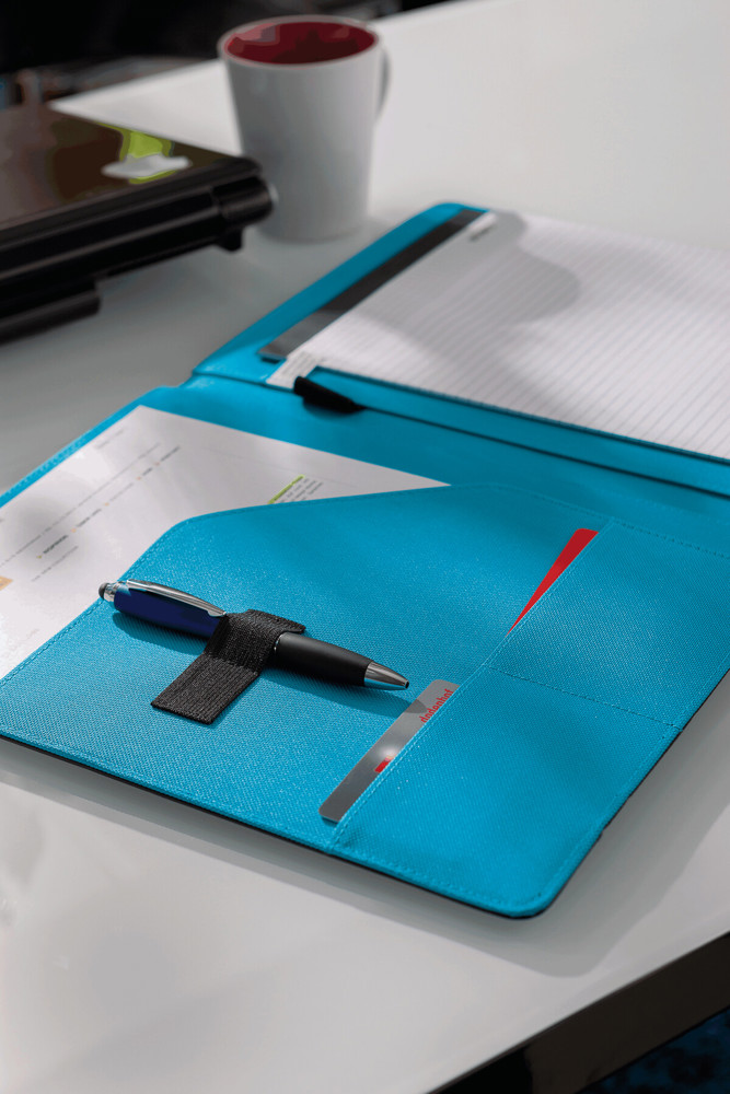 A4-portfolio YOUNG STAR van microfibre en 600D polyester met schrijfblok, penhouder, insteekvakken, elastische sluitband en gekleurde afwerking aan binnen- en buitenzijde.