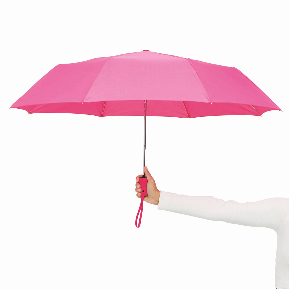 Automatisch te openen uit 3 secties bestaande paraplu, COVER met metalen steel, baleinen en tips. Met rubber coated handvat, polyester - pongee cover en beschermhoes.