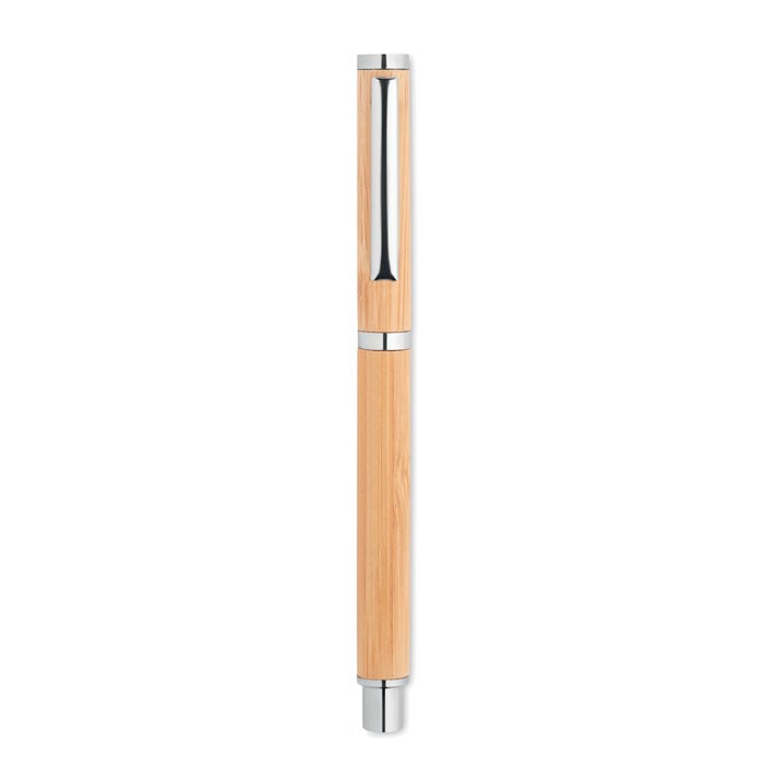 Bamboe rollerbalpen met roestvrijstalen uiteinden en details. Blauwe gel inkt. Maak notities tijdens belangrijke vergaderingen met deze gelpen. Het duurzame en natuurlijke bamboemateriaal geeft hem een moderne en stijlvolle look. Bamboe is een natuurproduct, er kunnen kleine variaties in kleur en grootte per item zijn, wat het uiteindelijke decoratie resultaat kan beïnvloeden. FSC®-certified | FSC 100%, N10, FSC-C213206
