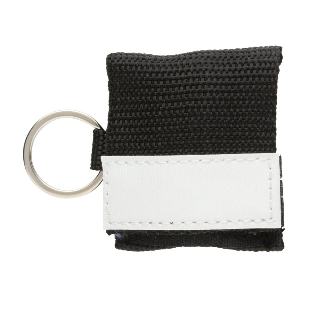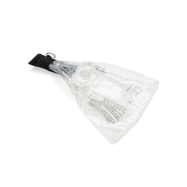 Sleutelhanger inclusief mond-op-mond beademingsmasker met terugslagklep, verpakt in rode etui met velcro sluiting. EN 13485:2016 goedgekeurd. Voorzien van eenrichtingsventiel. Opmerking: Dit artikel kan alleen in zwart worden afgedrukt.