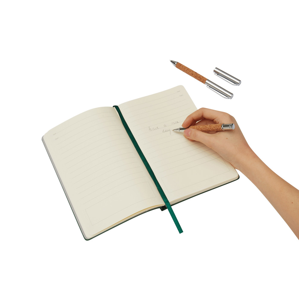 Pennenset CORK SIGNATURE: bestaande uit metalen draai-balpen (blauwschrijvend) en metalen rollerbal (zwartschrijvend) - greep-gedeelte van kurk, in mooie kurken geschenkbox