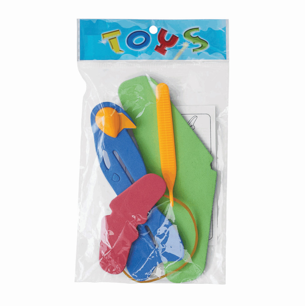 Foam vliegtuig SKY HOPPER om zelf in elkaar te zetten bestaande uit 3 foam vliegtuigdelen en een katapult met band van elastiek. Verpakt in een PVC tasje.