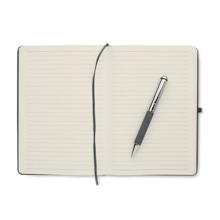 Cadeau set. A5 notitieboek van gerecycled leer (75%) met harde kaft. Ingebonden.160 gelinieerde...meer