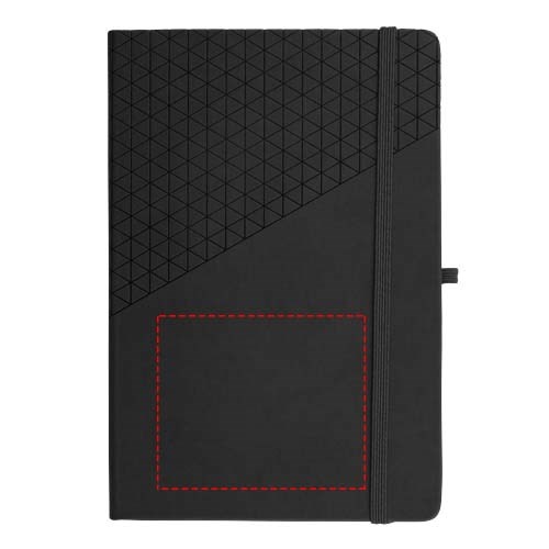 Soft touch A5 formaat notitieboek met geometrisch patroon design. 80 pagina's van 80 gram gelinieerd papier, paginalint, elastieksluiting en penlus.