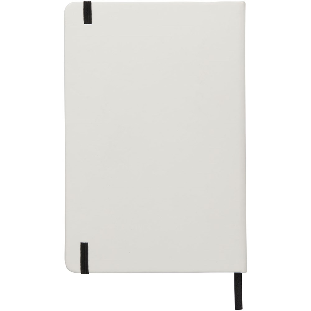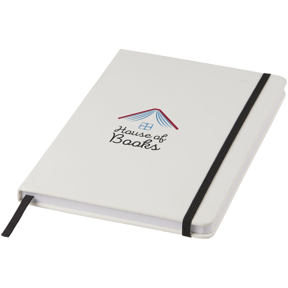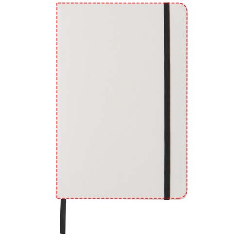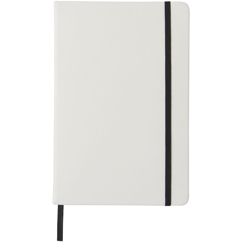 Witte A5 notitieboek met gekleurde elastische sluiting en lint. Inclusief 80 vellen (60 g / m2) gelinieerd papier. Digitaal printen mogelijk op omslag.