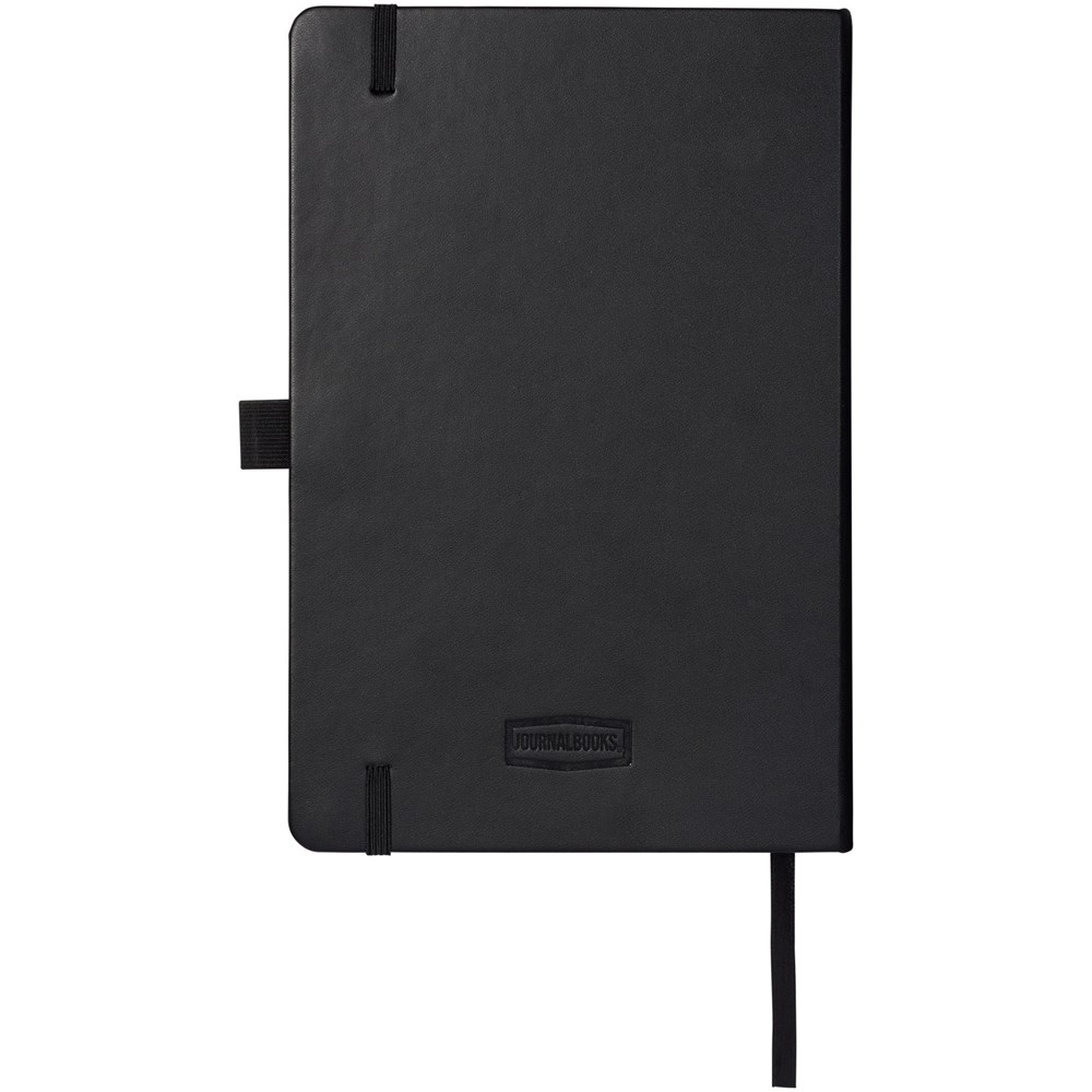 Kunstleren A5 (14,2 cm x 21,4 cm) notitieboek (karton bekleed met leerpapier) met elastische band, leeslint, pennenlus en accordeon-achterzak. Inclusief 96 vellen gelinieerd crèmepapier in 80 g/m2 en wordt aangeboden in een Journalbook witte hoes.