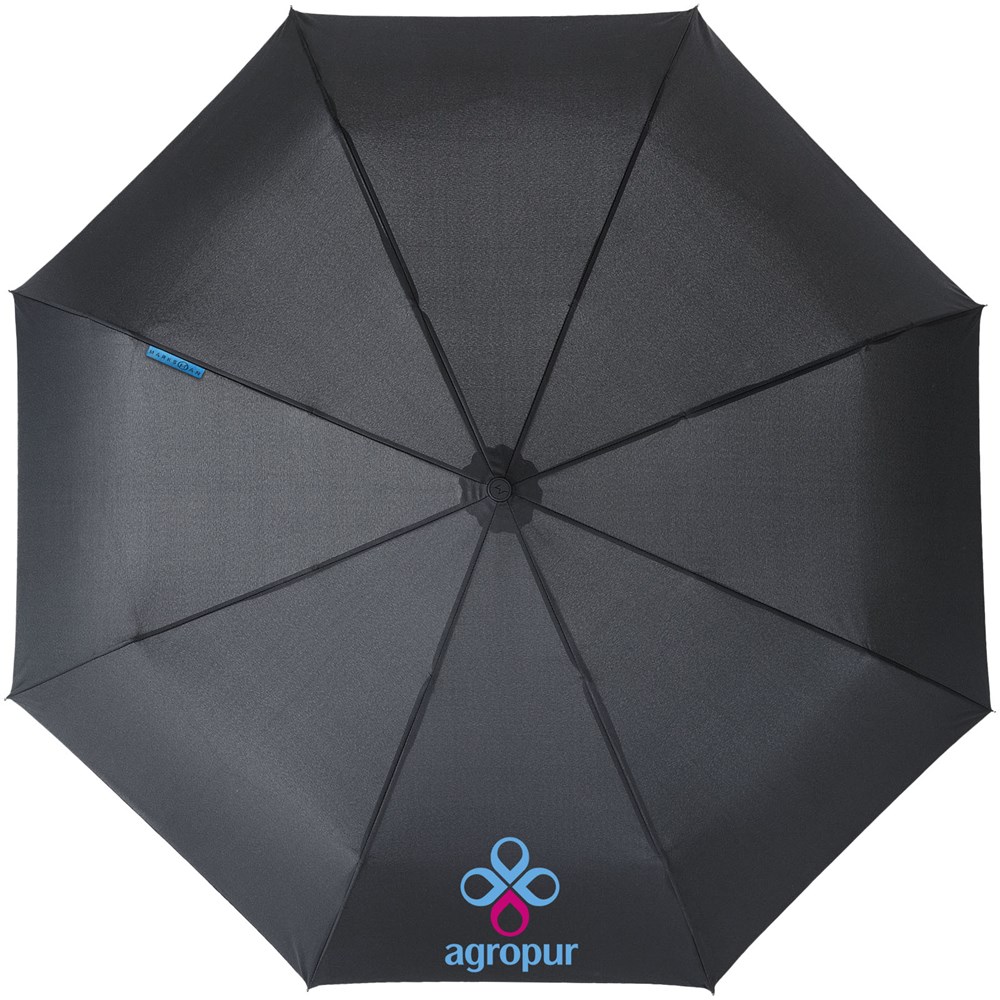 Exclusief ontworpen automatisch openende en automatisch sluitende 3-sectie paraplu. Zwart metalen schacht, glasvezel baleinen en een met rubber beklede kunststof handvat. Opvouwbaar tot 31 cm. Geleverd met een bijpassende hoes in de kleur van het scherm.