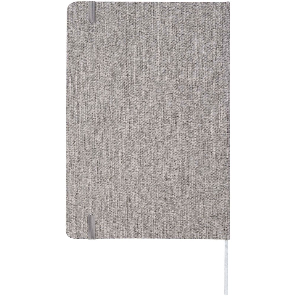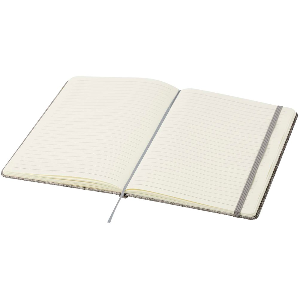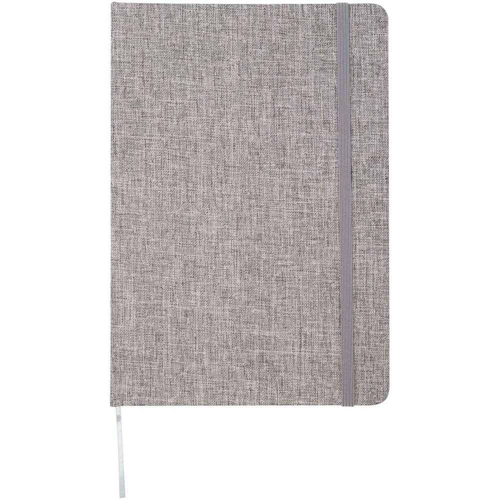 A5 notitieboek met harde kaft van gerecycled katoen met 80 gelinieerde vellen papier van 70 g/m². Het notitieboek heeft een elastische sluiting, een lint en afgeronde hoeken.