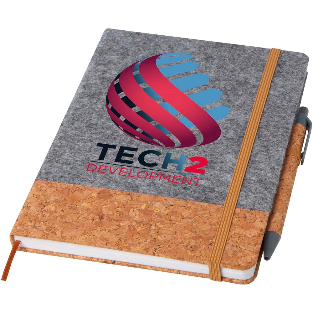 Het A5 notitieboek met harde kaft is gemaakt van kurk en gerecycled vilt en heeft 80 gelinieerde vellen papier van 70 g/m², een elastische sluiting, een lintmarkering en een penlus. De knop, clip en punt van de balpen zijn gemaakt van gerecycled plastic en de houder is gemaakt van kurk. Peninkt: zwart. Schrijflengte: 600 meter. Stiftmaat: 1,0 mm.