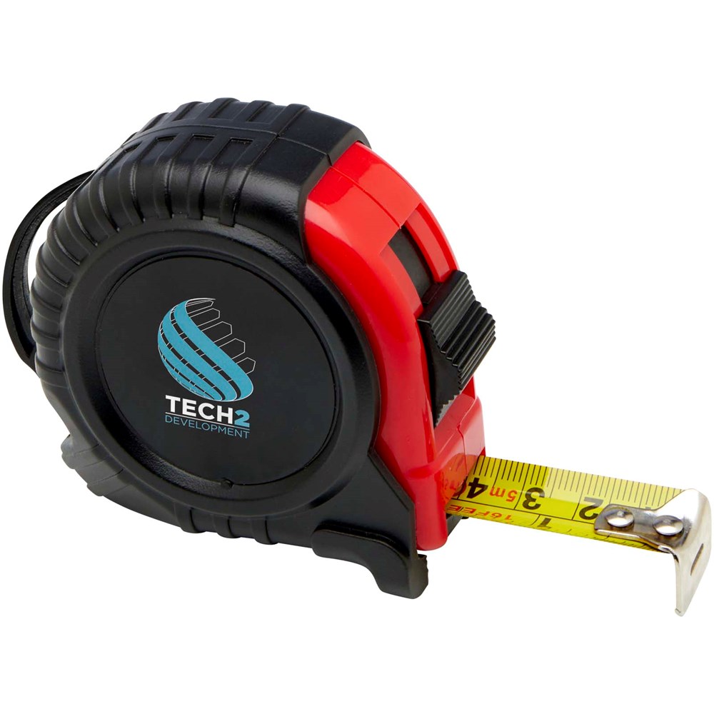 5 meter rolmaat met weergave in centimeters en inches, voorzien van een handige riemclip voor gemakkelijk meenemen.