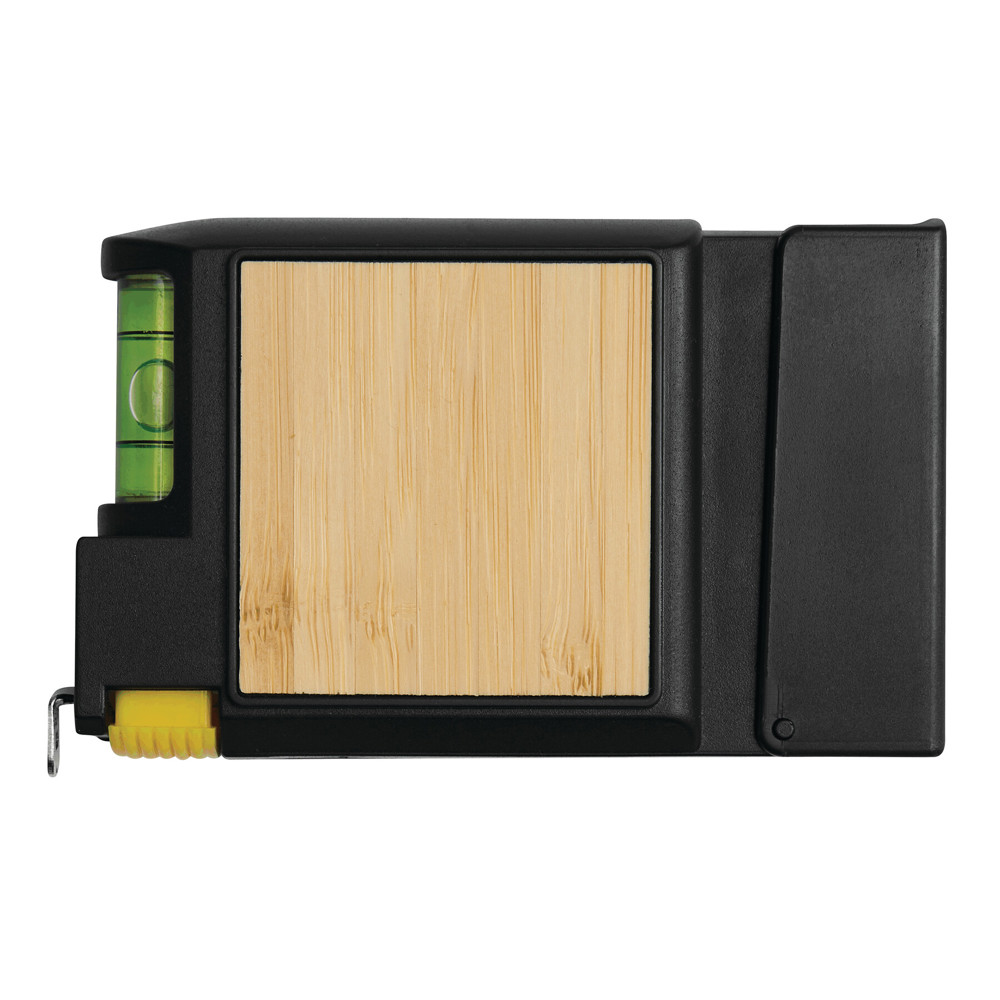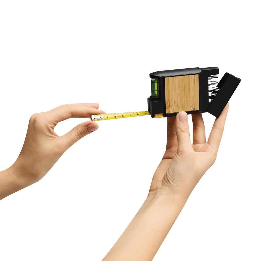Rolbandmaat SCREWY met oprolfunctie, waterpas en schroevendraaier met 5 verschillende bits, bamboeplaatje voor bedrukking, 3 m