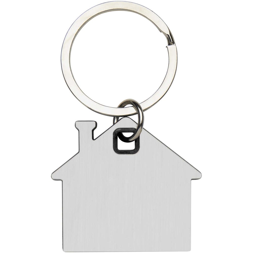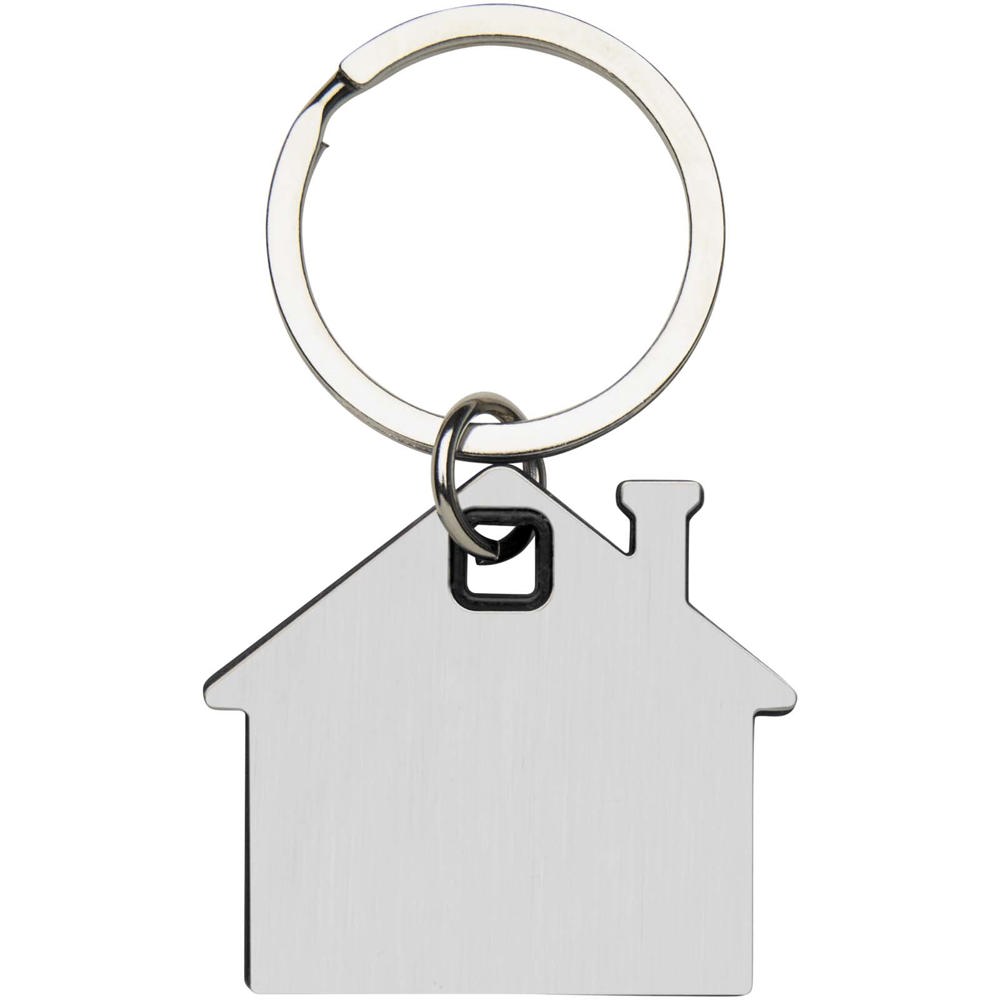 Sleutelhanger in de vorm van een huis, met een roestvrijstalen plaatje met een mat design aan de voor- en achterkant en een gekleurde plastic chip in het midden.