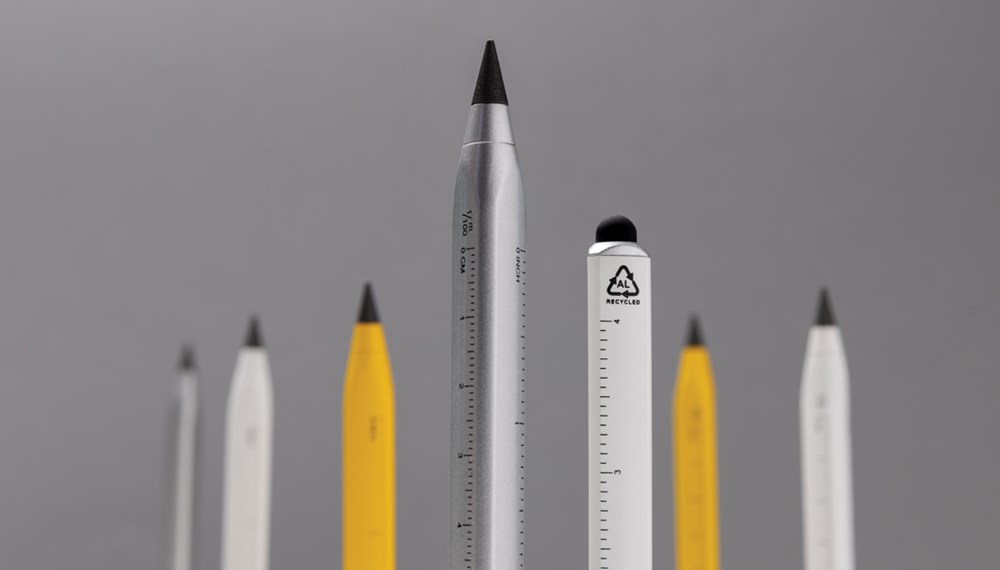 Moderne oneindigheidspen gemaakt van RCS-gecertificeerd gerecycled aluminium. Totaal gerecycled materiaal: 40% op basis van het totale gewicht van het artikel. RCS-certificering zorgt voor een volledig gecertificeerde toeleveringsketen van de gerecyclede materialen. Driehoekig gevormd model met één zijde met CM-aanduiding en één zijde met inches. Traditionele houten potloden schrijven slechts tot ongeveer 200 meter, maar deze boomvrije oneindigheidspen heeft een schrijflengte van tot wel 20000 meter met een grafietpunt om een grafietlijn te produceren. Niet alleen schrijft het als een potlood, maar de markeringen kunnen ook worden uitgegumd. Het werkt door een grafietlijn op papier achter te laten, net als een regulier traditioneel houten potlood, maar het slijt zo langzaam dat het tot wel 100 traditionele houten potloden zou kunnen overleven! Met een touchtip om een mobiel apparaat te bedienen. Verpakt in FSC® mix-verpakki