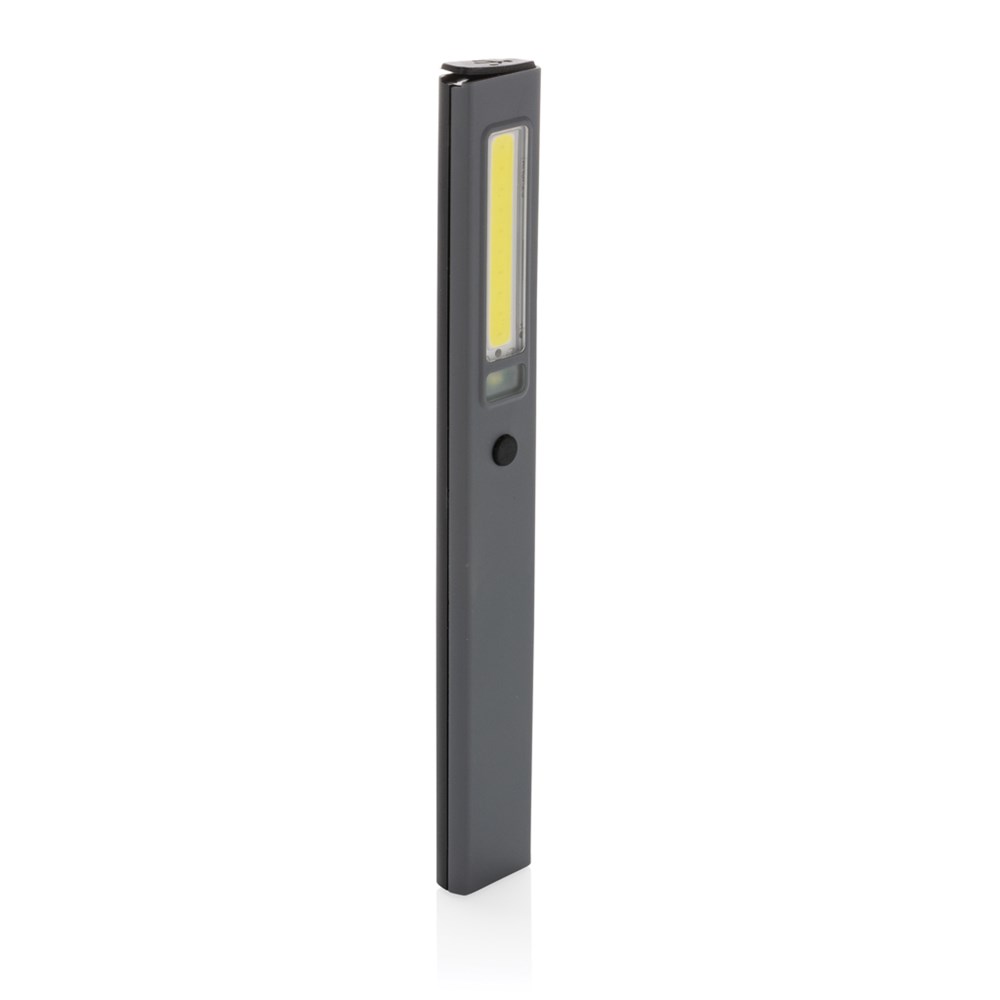 Zakformaat inspectielamp gemaakt van RCS-gecertificeerd gerecycled ABS-plastic. Totale gerecyclede inhoud: 33% op basis van het totale gewicht van het artikel. RCS-certificering garandeert een volledig gecertificeerde toeleveringsketen van de gerecyclede materialen. De inspectielamp maakt gebruik van een oplaadbare A-klasse 520 mAh lithiumbatterij, dus je hoeft de batterijen niet te vervangen. Gewoon opladen via je USB-poort. De inspectielamp wordt geleverd met een 220 lumen COB-licht en een 80 lumen LED-licht. Met 3 modi: LED, COB en COB rood. Met clip om aan een riem of zak te bevestigen en een magneet. Met type C-poort voor opladen. Gebruikstijd op één lading: 3 uur