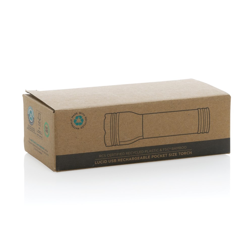 USB-oplaadbare 1W-zaklamp gemaakt van FSC® 100% bamboe en RCS (Recycled Claim Standard) gecertificeerd gerecycled ABS. Totale gerecyclede inhoud: 23% op basis van het totale gewicht van het item. RCS-certificering zorgt voor een volledig gecertificeerde toeleveringsketen van de gerecyclede materialen. De zaklamp wordt geleverd met een 500 mAh lithium batterij van klasse A. De zaklamp kan tot 3 uur worden gebruikt op één enkele lading en kan in 2,5 uur worden opgeladen via type-c. De straalafstand is 50 meter en biedt 90 lumen. Met 3 modi (helder, medium en knipperend). Inclusief RCS-gecertificeerde gerecyclede TPE-oplaadkabel. Verpakt in FSC® mix kraft verpakking. Item en accessoires 100% PVC-vrij.