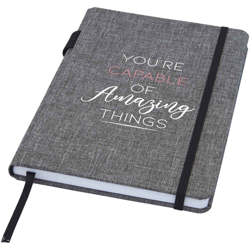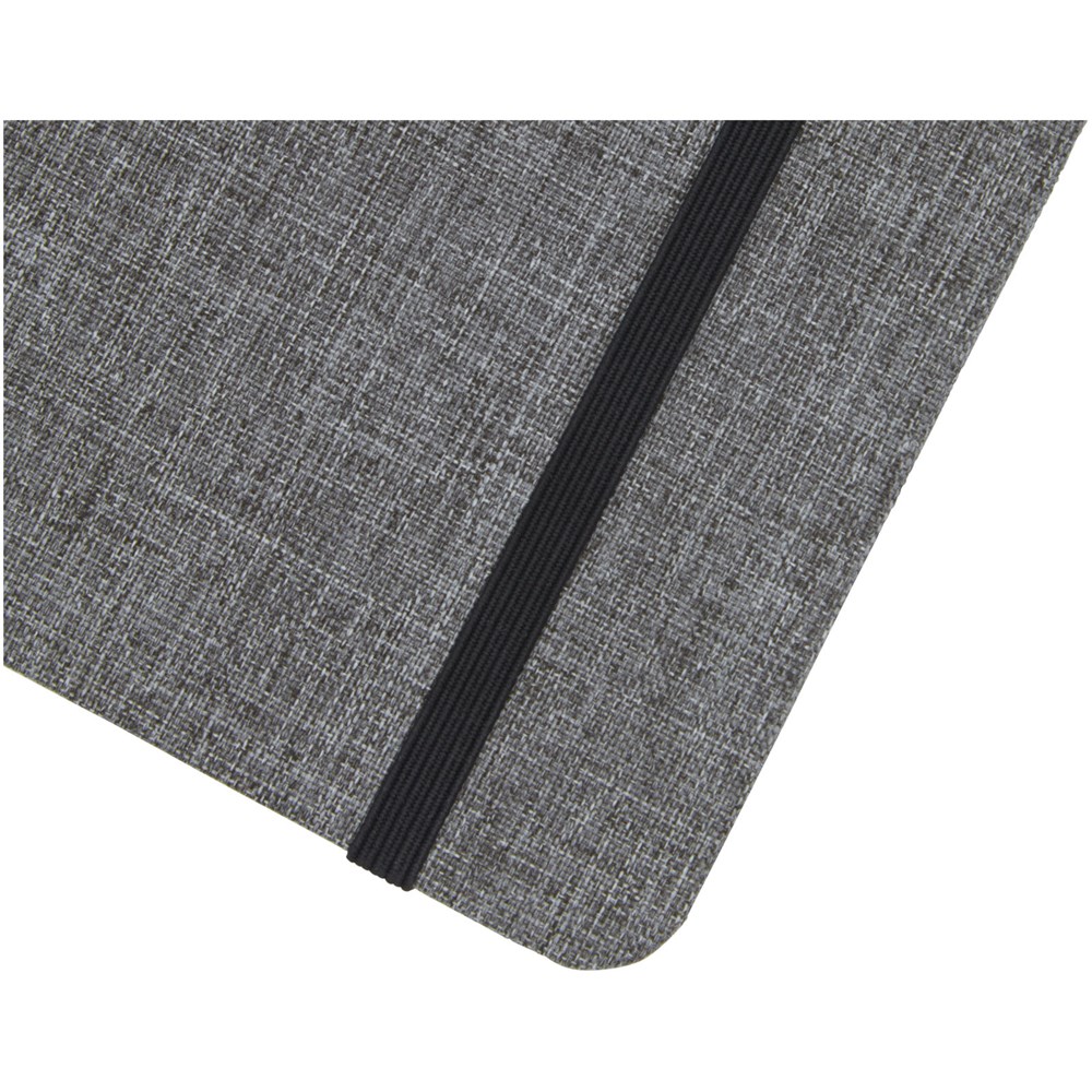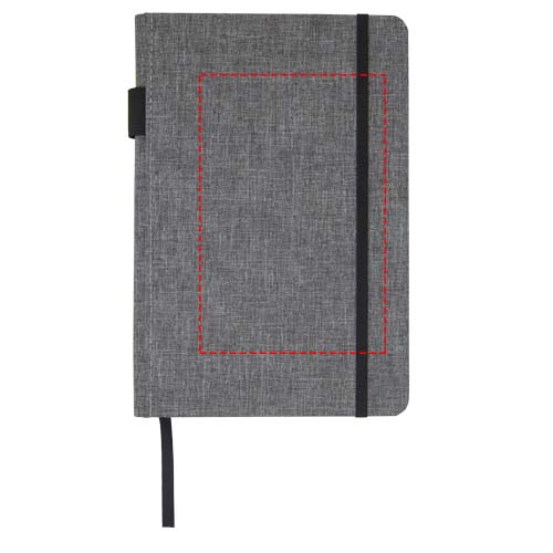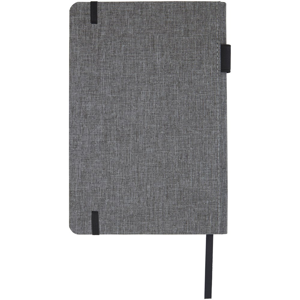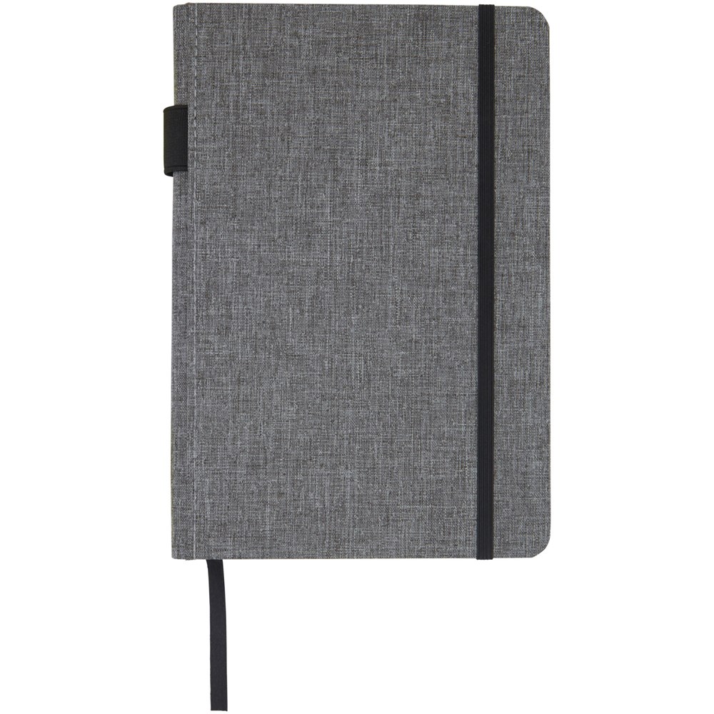 Notitieboek in A5 formaat met cover gemaakt van RPET-stof. Bevat 96 vellen 70 g/m² gerecycled papier met gelijnde lay-out, een penlus en lint. Verpakt in een kartonnen hoes.