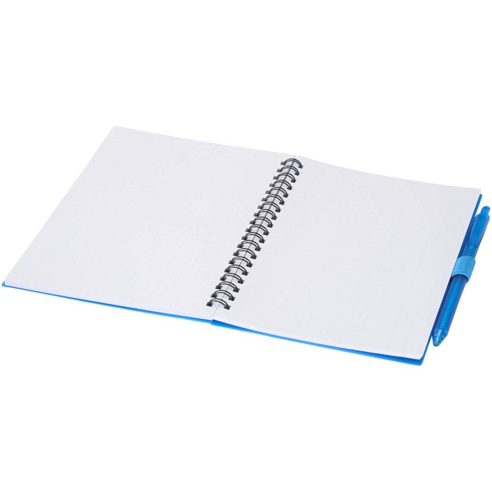 De Niove notitieboek met zachte kaft is gemaakt van gerecycled plastic met 70 gestippelde vellen papier van 70 g/m². Het notitieboek heeft vierkante hoeken en een lus voor een pen. Notitieboekformaat: 140 x 178 mm. De balpen is eveneens gemaakt van gerecycled plastic. Inktkleur: Blauw. Schrijflengte: 1000 meter. Stiftmaat: 1,0 mm.