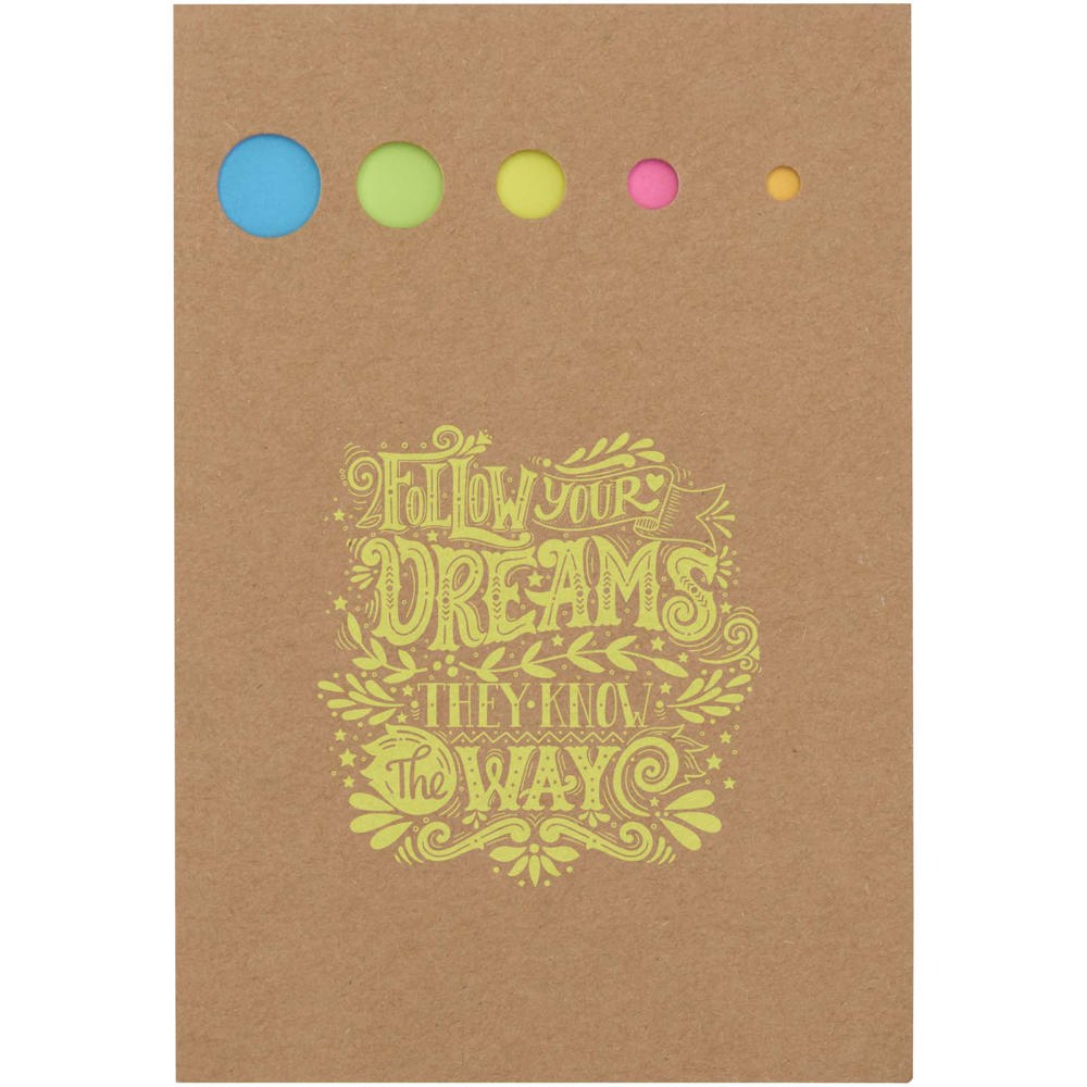 De Freiji is een handige houten boekenlegger met 125 kleurrijke kleine sticky notes (4,2 x 0,6 cm) en 25 grote (4,2 x 4 cm) gele sticky notes.