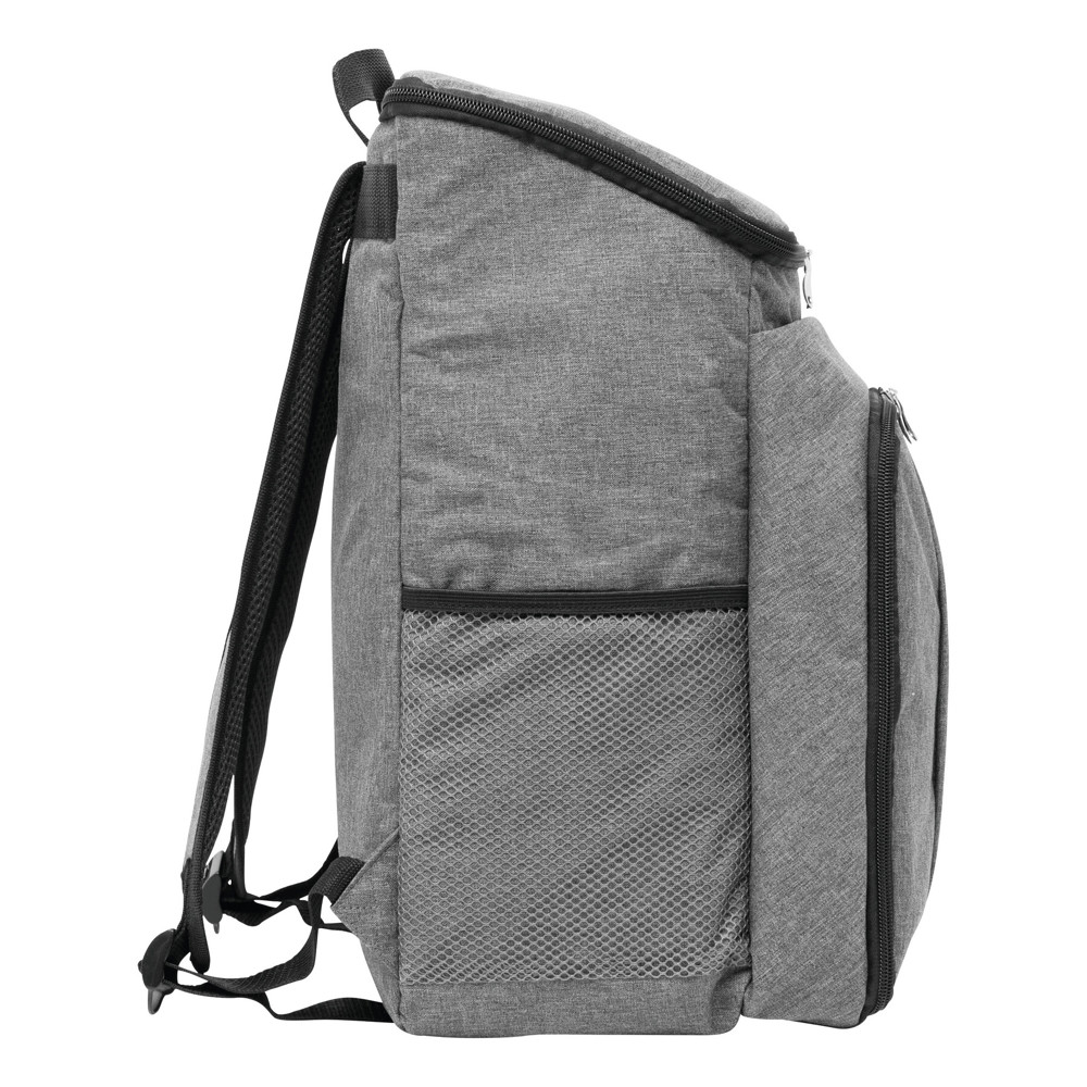 Picknickrugtas LEISURE DAY voor 2 personen: voorzien van een geïsoleerd hoofdvak met rits, met een voorvak met rits voorzien van bestek, kunststof serviesgoed en wijnglazen, met 2 netvakken aan de zijkant buitenkant, met draagriem en gewatteerde schouderbanden.