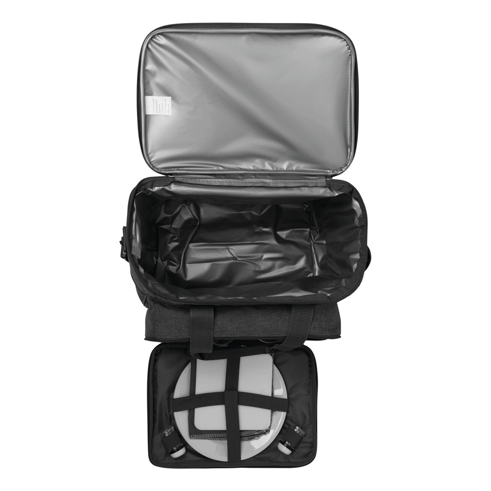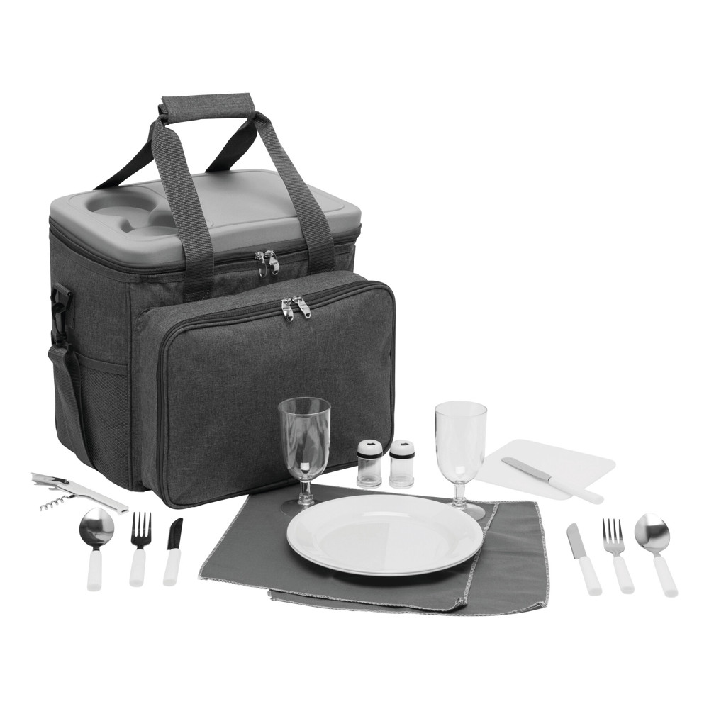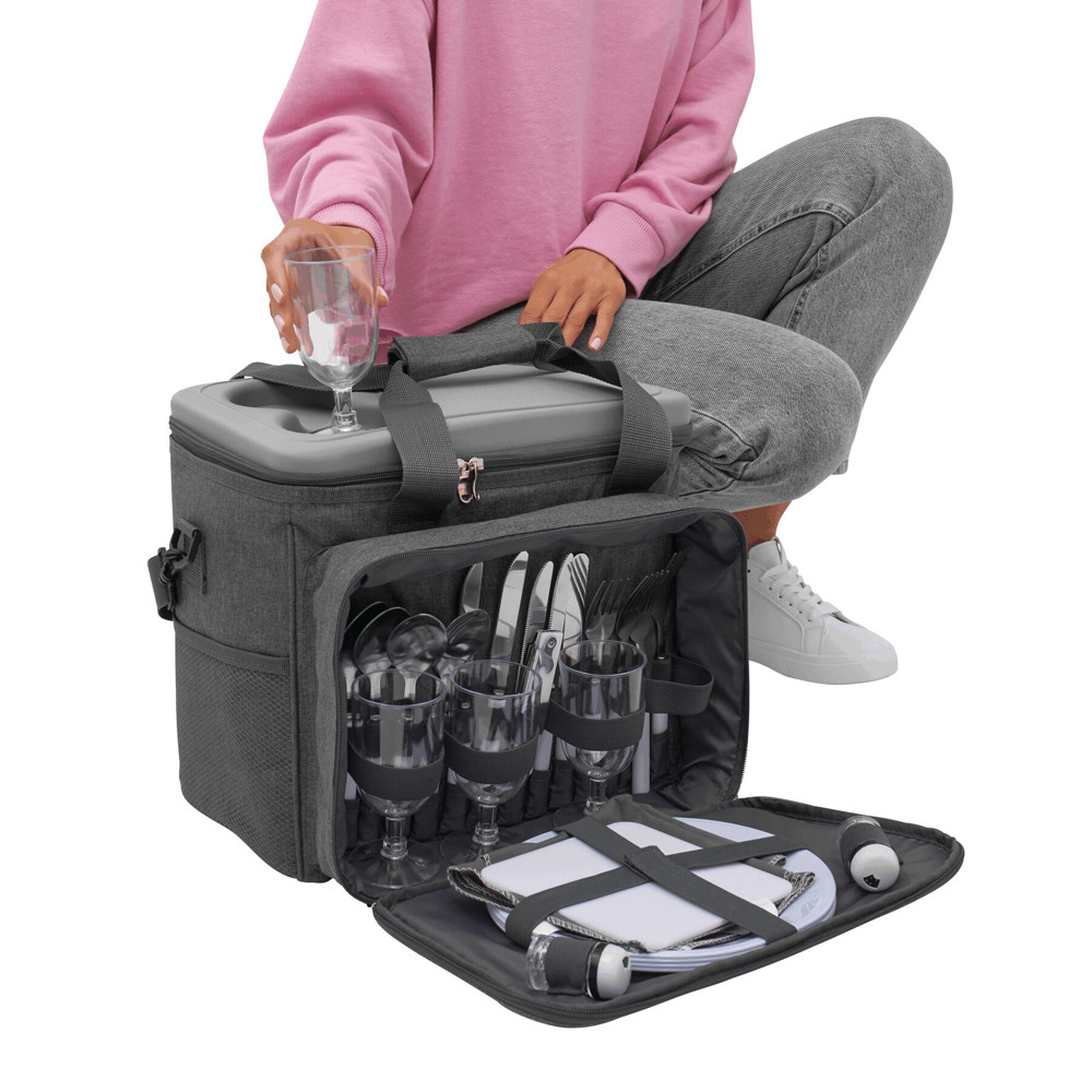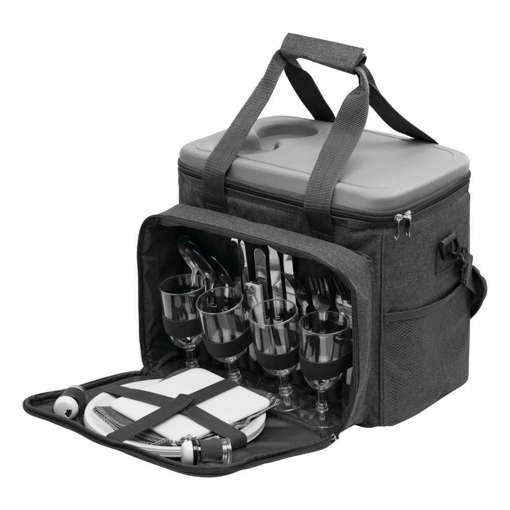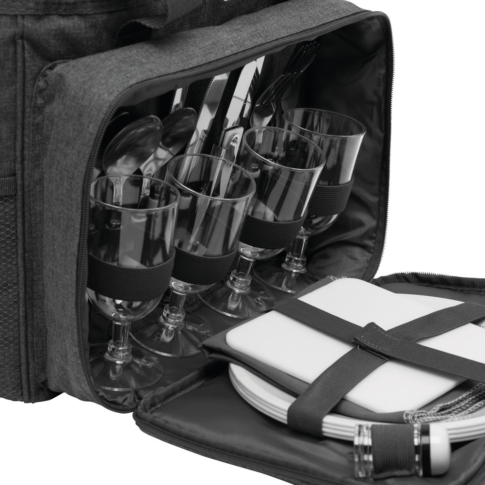 Picknicktas SIDE TRIP voor 4 personen voorzien van een geïsoleerd hoofdvak met rits, met praktische afstelfuncties in het vak aan de bovenkant, voorvak met rits incl. bestek, kunststof servies en wijnglazen, kelnermes, servetten, peper- en zoutstel, evenals een snijplank, 2 netvakken aan de zijkant buitenkant, met verstelbare en afneembare schouderband en 2 handgrepen.