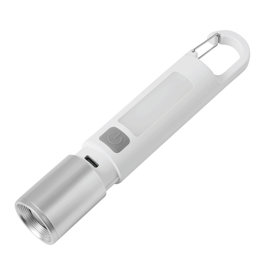 Oplaadbare LED-zaklamp FLOODLIGHT: Aan de voorzijde LED met 2 lichtstanden (continu en knipperlicht) en verstelbare lichtbundel, zijverlichting met 7 LED’s, rubberen aan/uit-schakelaar, met karabijnhaak voor bevestiging (de karabijn is NIET geschikt als beveiliging bij klimmen), krachtige lithiumbatterij, capaciteit: 800 mAh, incl. USB-oplaadkabel met USB-C stekker (lengte ca. 30 cm), verpakt in een doos