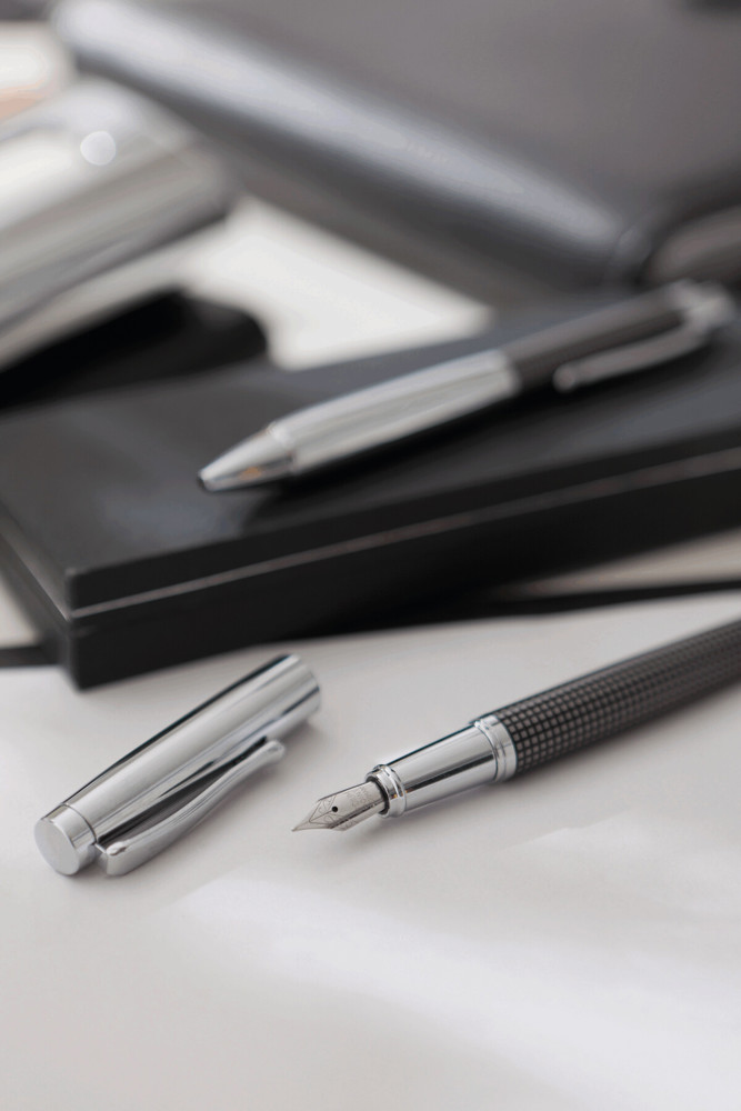 Elegante pennenset NOBLESSE bestaande uit blauw schrijvende balpen en vulpen met ruitpatroon.