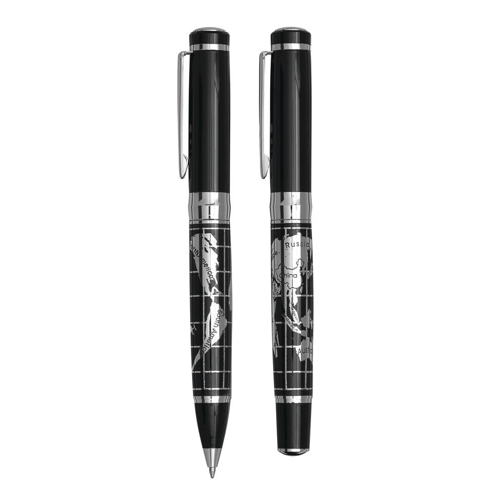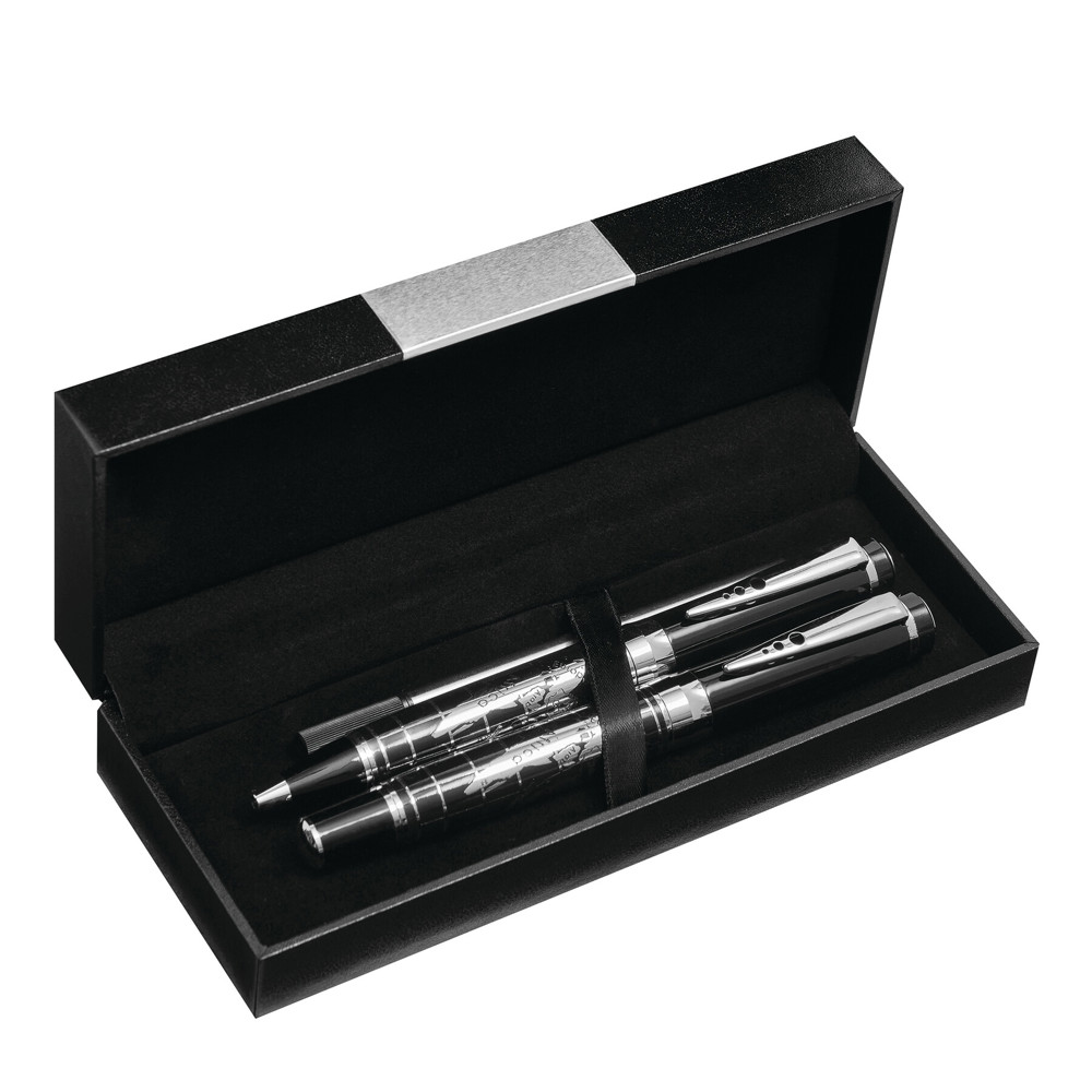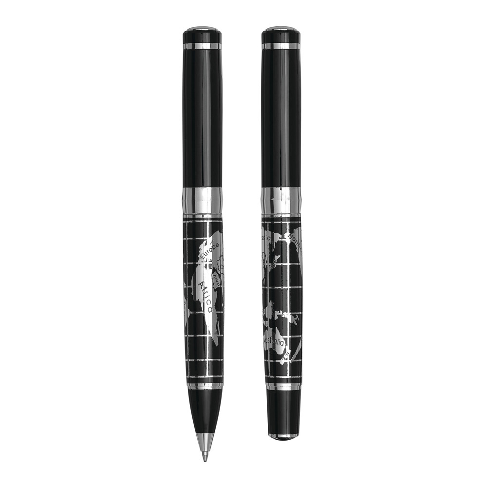 Exclusieve metalen pennenset INTERCONTINENTAL bestaande uit een rollerball en een balpen met wereldkaartdesign. Inclusief zwarte geschenkdoos.