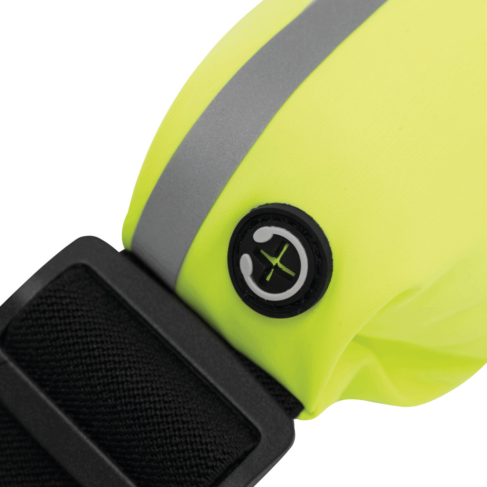 Hardloop heuptasje SEE ME. Deze spatwaterdichte running-belt heeft een kabeluitgang, een elastische band met musketonhaak, reflecterende details en is ideaal voor hardlopen, fietsen, wandelen en andere actieve sporten.