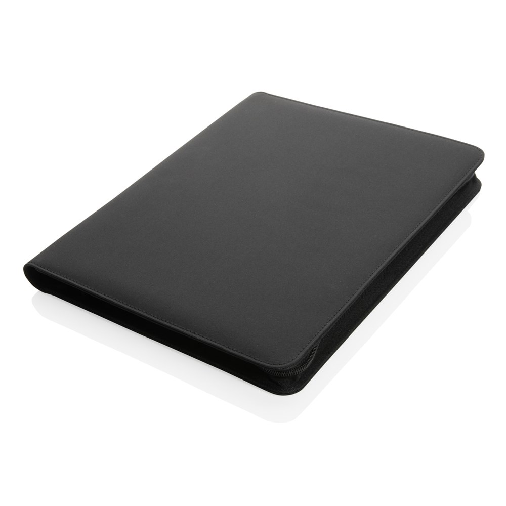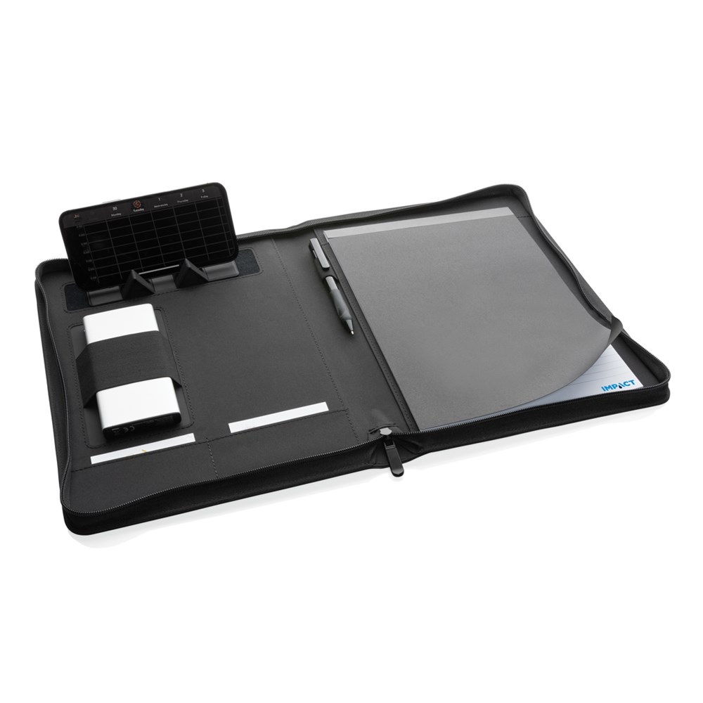 Deze A4 Impact AWARE™ deluxe 300D tech portfolio met ritssluiting voegt een beetje extra verfijning toe aan je werk. Bewaar uw belangrijke documenten, kaarten en notities bij elkaar. In het A4-portfolio vindt u een gelinieerd schrijfblok van 64 g/2 gerecycled papier met 20 pagina's. Binnenin is er 1 telefoonvak, een telefoonhouder, pennenlus en 2 sleuven voor visitekaartjes. Met AWARE™ tracer die het echte gebruik van gerecyclede materialen valideert. Elke portfolio heeft 8 0,5L PET-flessen hergebruikt. 2% van de opbrengst van elk verkocht Impact-product wordt gedoneerd aan Water.org. PVC-vrij.