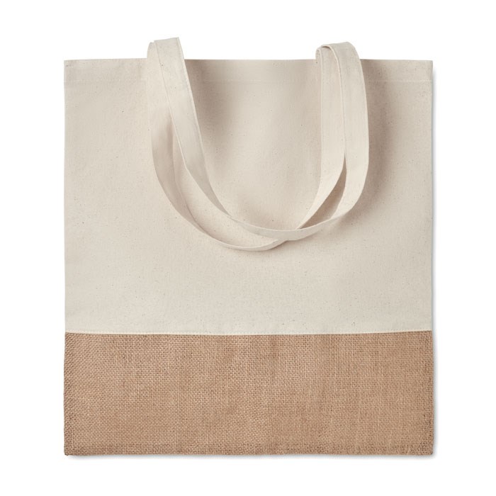 Boodschappentas van twill katoen met lange hengsels en jute detail aan de onderzijde. 160 g/m².