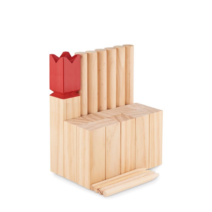 Dennenhouten werpspel gepresenteerd in een katoenen trekkoordzak. Dit spel, van Zweedse en Scandinavische oorsprong, is leuk voor kinderen, families of een groep vrienden en wordt meestal buiten gespeeld. Het doel is om de grotere houten stokken omver te werpen door de kleinere naar hen te gooien. Het middelste stuk, de koning, wordt als laatste omgegooid. De eerste die ze allemaal omver gooit voordat de tegenstander dat doet, wint. Inclusief 10 stuks korte vierkante stokjes, 4 stuks puntige stokjes, 6 stuks ronde stokken en 1 koningsstok.