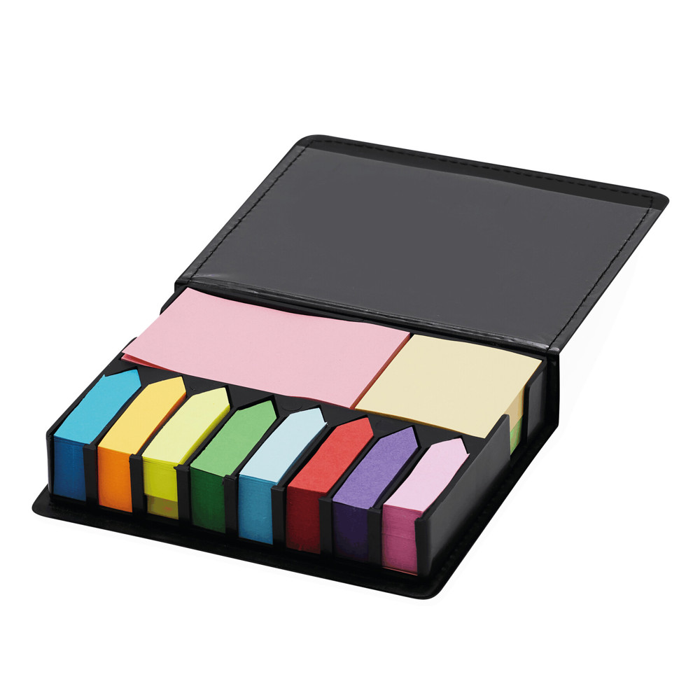 Kunstlederen box met zelfklevende memoblaadjes REMIND ME bestaande uit 3 modellen blaadjes in 12 verschillende kleuren.
