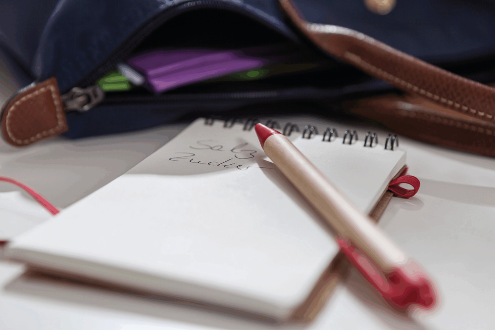 Notitieboekje RECYCLE M van gerecycled papier, met balpen (zwartschrijvende inkt) en elastiek sluiting.