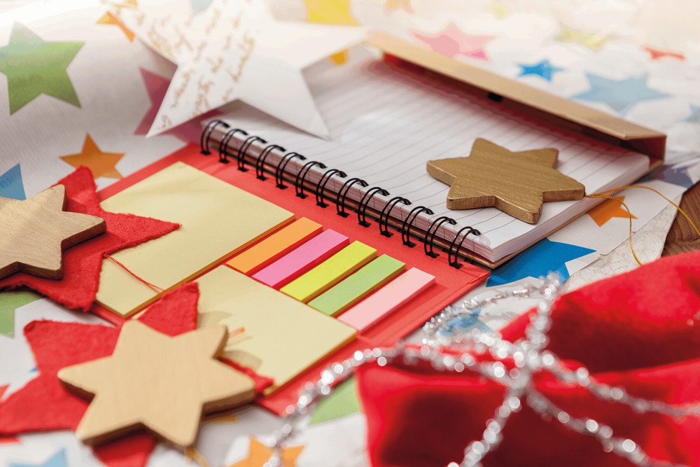 Notitieboekje van gerecycled papier met balpen MAGNY. Boekje met gelinieerd papier, 2 memoblokjes, 5 verschillend gekleurde momostrips en een magnetische sluiting.