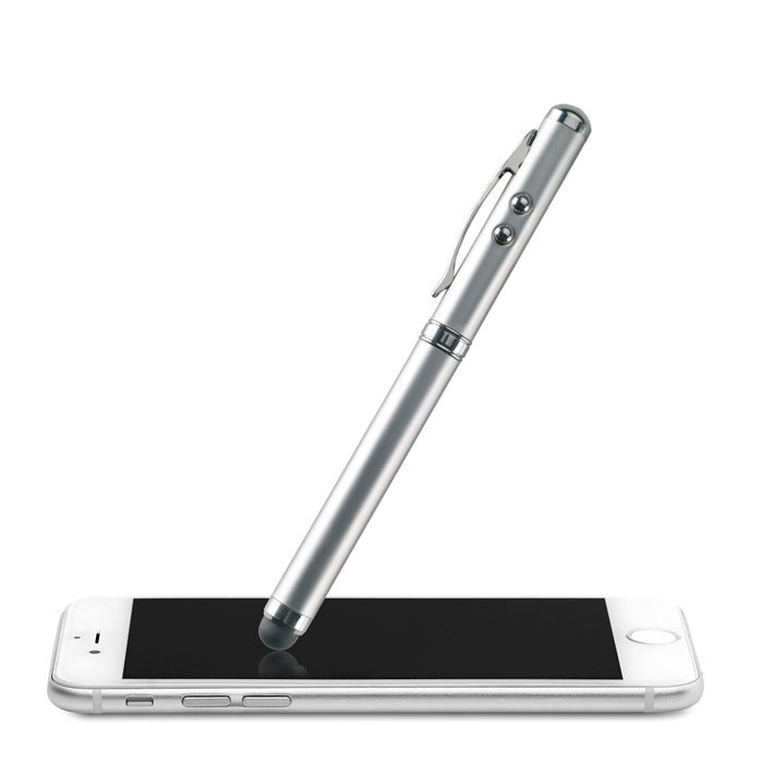 Multifunctionele balpen met zilver gespoten metalen behuizing. Zwarte inkt, wit LED licht, rode laser pointer en touch pen voor touchscreens. Incl. 3 knoopcel batterijen. Geleverd in bijpassend metalen doosje.